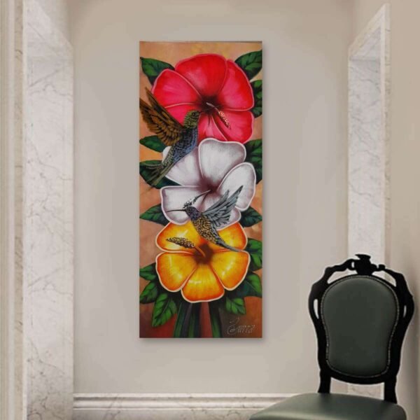 Material: Acrílico sobre lienzo Soporte: Lienzo tensado sobre bastidor y marco MDF color caramelo. Formato: 70 x 160 cm Artista: Sharon Pulido Año: 2020
